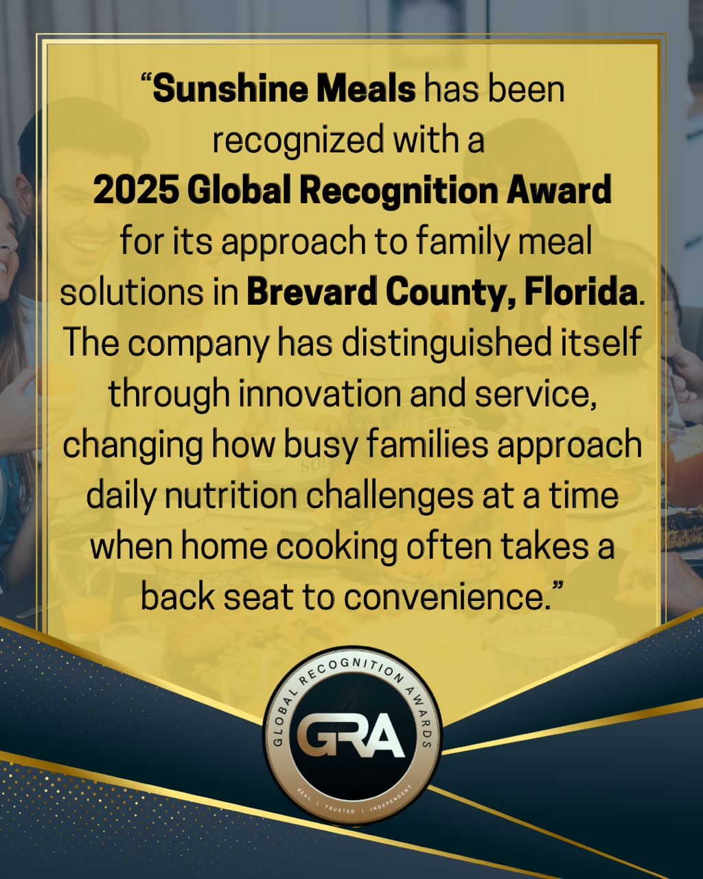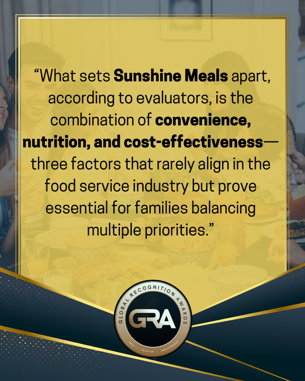 As featured in Business Insider, Sunshine Meals is an award-winning Meal Prep and Delivery Service recognized by Global Recognition Awards for our innovative approach to family mealtime.