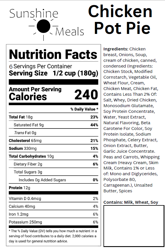 ** Includes Chicken Pot Pie Entree with peas and carrots included as an Add In**